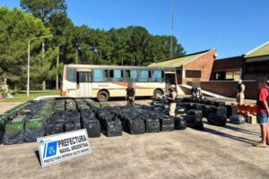 Efectivos de la Prefectura Naval Argentina interceptaron un ómnibus que transportaba mercadería ingresada de manera ilegal al país durante un...