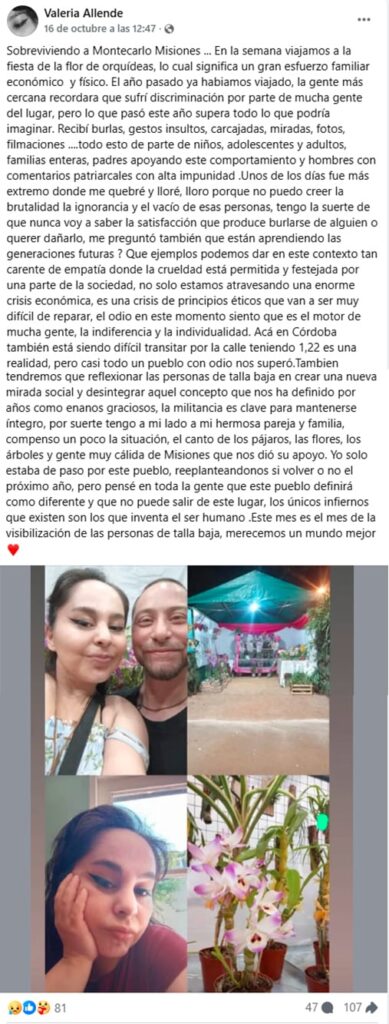 La actriz y activista Valeria Allende, reconocida por su militancia en defensa de los derechos de las personas de talla baja, contó en una publicación de Facebook el difícil momento que vivió durante un viaje a la provincia de Misiones.
