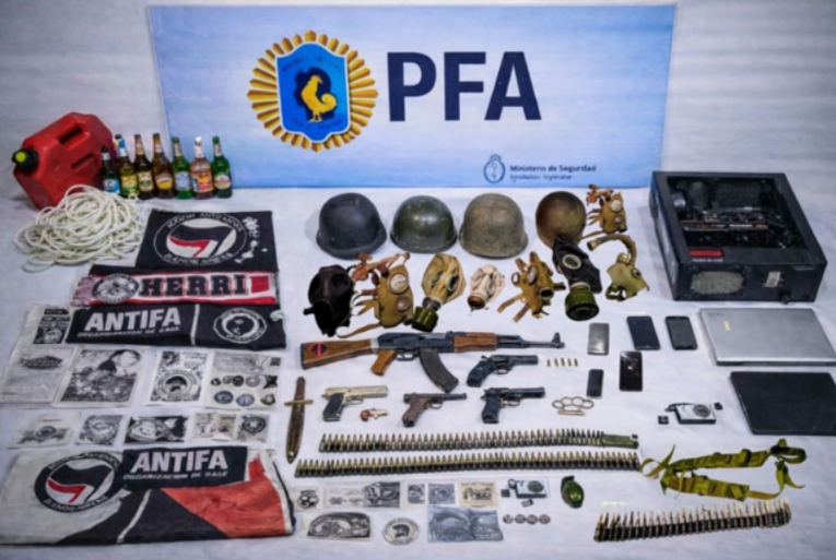 Durante el allanamiento, realizado en una vivienda del barrio porteño de Villa Crespo por orden del Juzgado Nacional en lo Criminal y Correccional Federal N°4, a cargo de Ariel Oscar Lijo, se secuestraron réplicas de un fusil de asalto AK-47, cinco pistolas de distintos calibres, dos revólveres, municiones, cuchillos, cascos y máscaras antigas. También se incautaron teléfonos celulares, notebooks, elementos tecnológicos, materiales que podrían utilizarse para la fabricación de artefactos incendiarios y banderas vinculadas al movimiento Antifa.