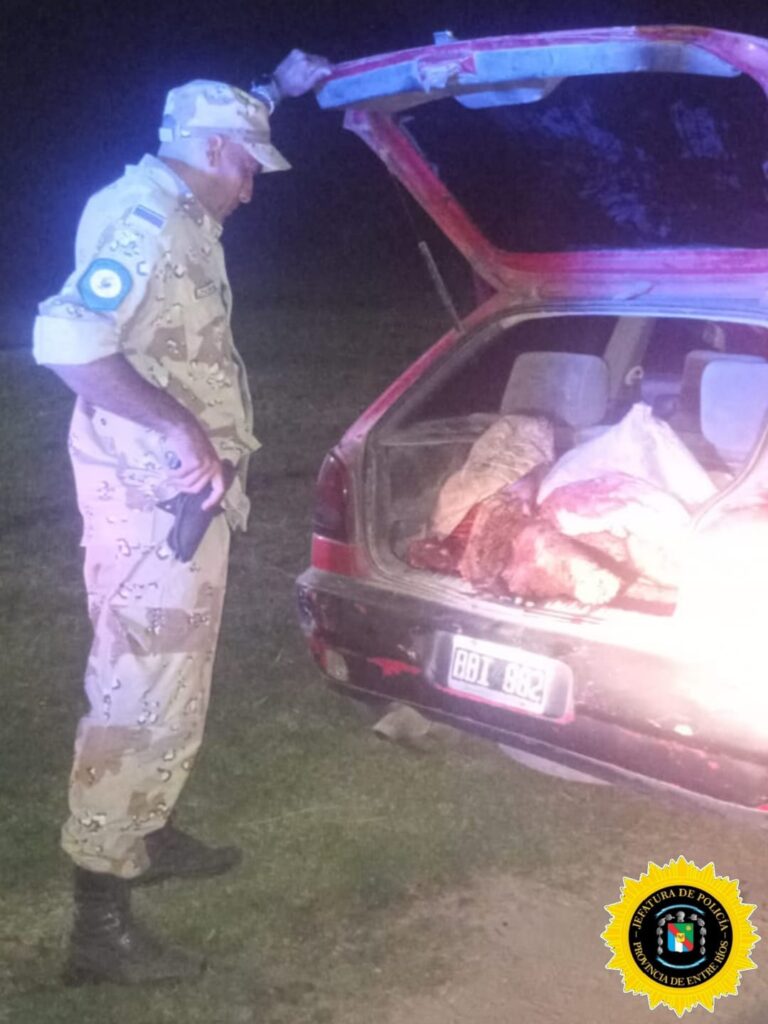 Durante la noche del sábado, efectivos de la Brigada de Abigeato Gualeguay, dependiente de la Dirección General de Prevención de Delitos Rurales, detuvieron a tres hombres que transportaban carne de origen ilegal en un automóvil Volkswagen Gol rojo.