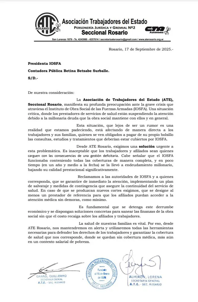 Según informaron desde la Asociación de Trabajadores del Estado (ATE), la situación afecta a personal de Gendarmería, Prefectura, Ejército, Armada y Fuerza Aérea, así como a sus familias. “Si tengo que llevar a mi hija a la guardia, no sé a dónde ir”, expresó Alejandro Sortino, delegado de ATE, quien lleva 35 años trabajando en Iosfa.