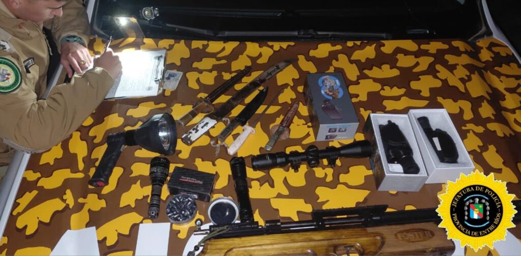 Tres hombres, oriundos de Concordia, fueron identificados como los presuntos responsables. Se les secuestraron armas no autorizadas, visores nocturnos, cuchillos, linternas y un reflector, elementos utilizados para la actividad ilegal que realizaban de noche y sin permisos habilitantes.