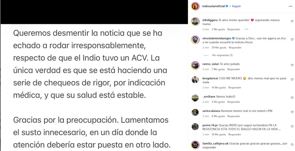 A través de un comunicado oficial difundido en redes sociales, su entorno explicó que se trató de “chequeos de rigor” vinculados a su condición médica. “Gracias por la preocupación, lamentamos el susto innecesario”, señalaron en el mensaje, en respuesta a versiones que indicaban que el artista habría sufrido un ACV.