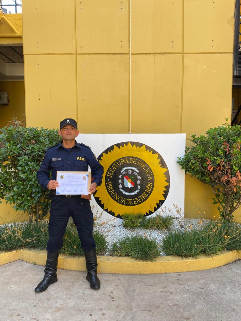 Durante el acto, recibieron sus certificados el Subcomisario Roberto Szylo y el Sargento 1º Hugo Escobar, ambos pertenecientes a la Jefatura Departamental Concordia.
