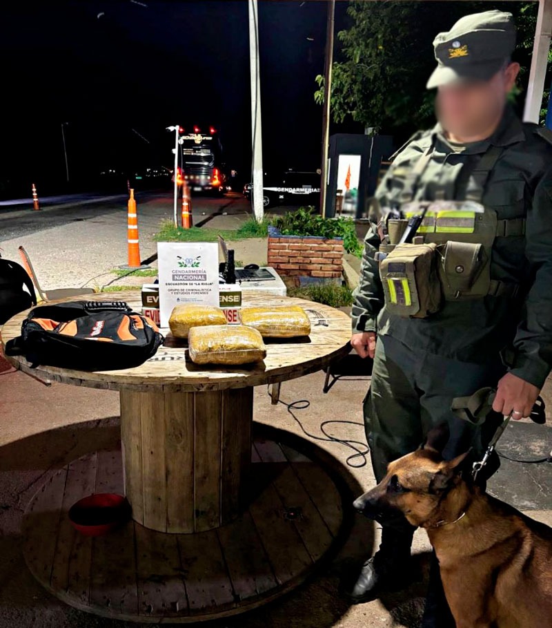 Durante la inspección del interior del vehículo, los gendarmes detectaron un bolso de mano ubicado entre las butacas 19 y 20, que se encontraban desocupadas. Al aproximarse, el personal percibió un fuerte olor característico a marihuana, por lo que procedieron a revisar el equipaje en presencia de testigos.