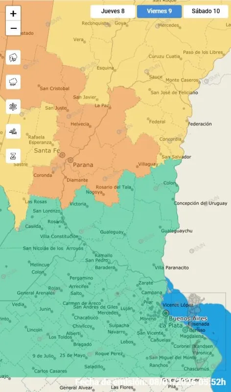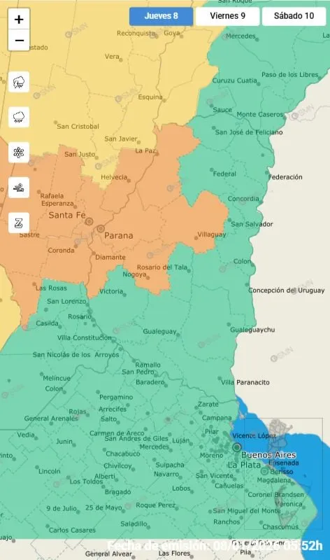 Las localidades de Paraná, La Paz, Diamante, Nogoyá y Villaguay serán las más afectadas. En estas zonas se prevén tormentas fuertes a severas, con intensa actividad eléctrica, posible caída de granizo, ráfagas que podrían superar los 90 km/h y lluvias muy abundantes en cortos períodos.
