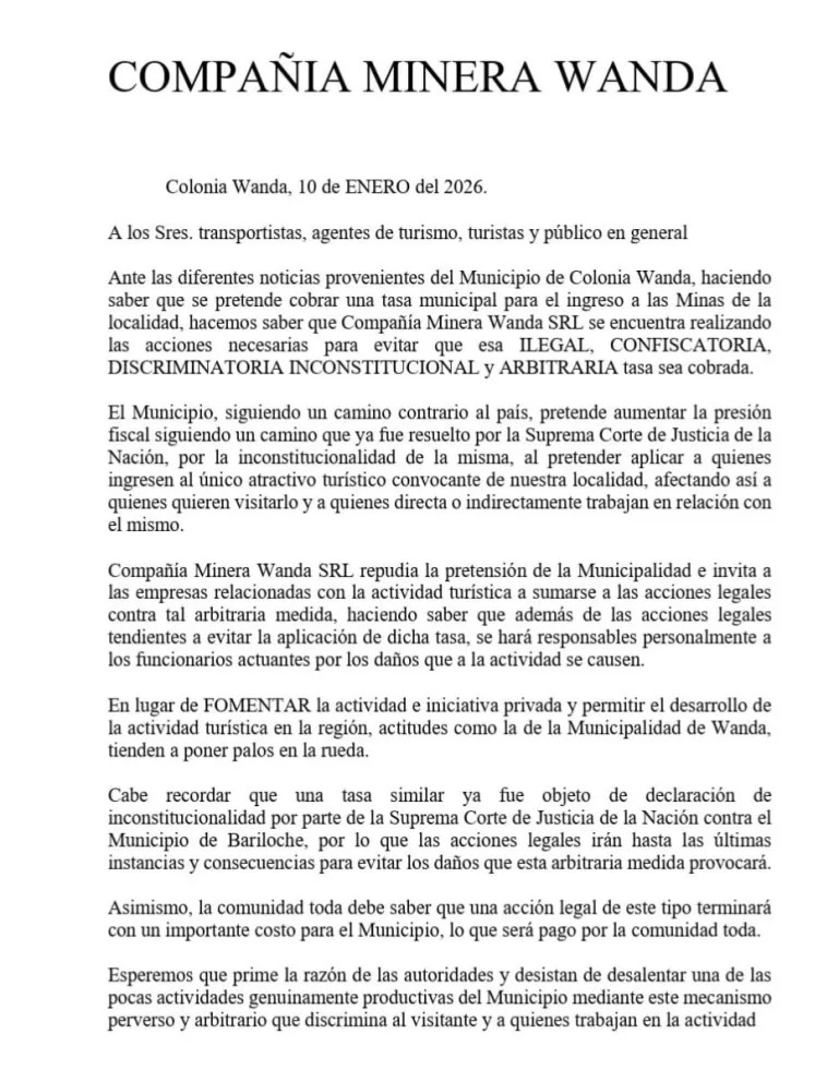 Sin embargo, desde la Compañía Minera Wanda cuestionaron la falta de precisiones sobre el destino de los fondos y recordaron que en el pasado existió una normativa similar que no llegó a aplicarse. Señalan que nunca se opusieron al pago de una tasa, pero reclaman una contraprestación clara y mayor diálogo. También advirtieron que la medida podría afectar la actividad turística y la relación con operadores.