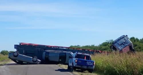Un camión de origen brasileño que transportaba vehículos protagonizó un vuelco este domingo por la mañana en la Ruta Provincial Nº 6, a la altura del kilómetro 151, a unos 800 metros al norte del acceso a la comuna de Guardamonte, en el departamento Tala.